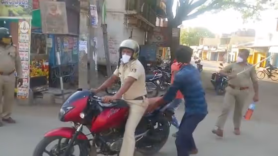 Attempting to teach the erring youths and bikers who refuse to stay home and roam around the streets during lockdown, Ron Police in North Karnataka have hit upon the idea to make bikers push their motorcycles while hitting them with lathis