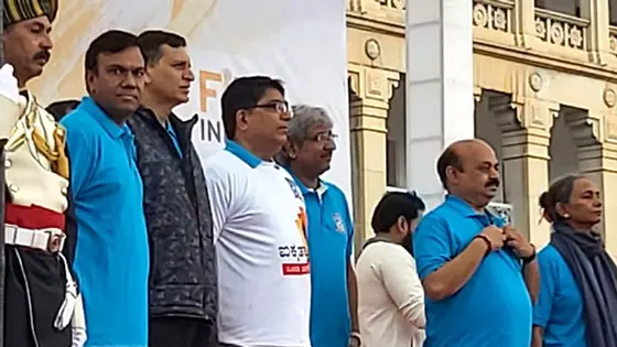 Karnataka home minister Basavaraj Bommai flagged of the marathon from the grand steps of Vidhana Soudha in Bengaluru.