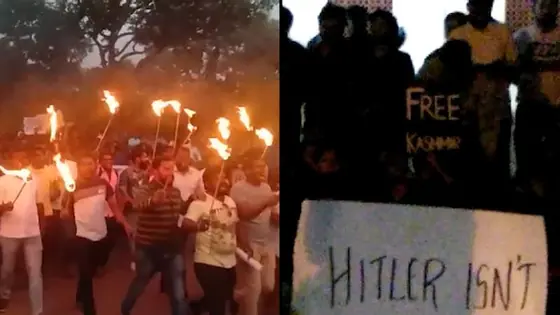 More than 300 students from Mysore University staged a protest over the JNU attack and one of the protesters was seen displaying ‘Free Kashmir’ poster. Reactions poured in from political parties as BJP called it a conspiracy and Congress asked police to verify it.