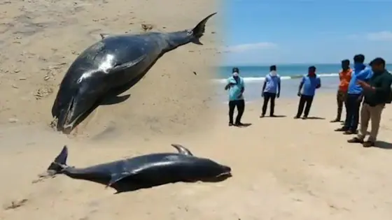 Thoothukudi: The carcass of a female bottlenose dolphin was washed ashore in Pullaveli coastal village in Thoothukudi district of Tamil Nadu on Monday morning. The dolphin died after suffering an injury, according to officials. Forest department officials said the carcass of the 10-foot-long dolphin was first spotted by fishermen of the village around 8 am.