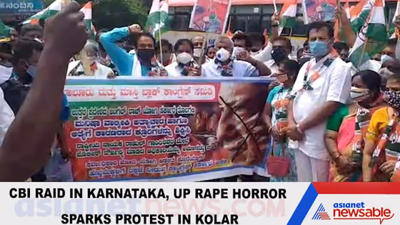 Hundreds of Congress workers protested in Kolar to condemn the law and order situation in Uttar Pradesh and raids at KPCC President DK Shivakumar's house and office premises.
