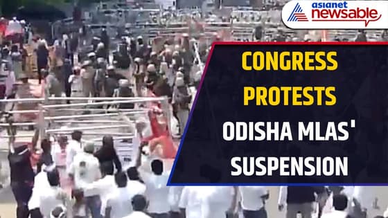 Congress workers hold protest outside Odisha Assembly against the suspension of 14 Congress MLAs from the House; Police use water cannons to disperse protesters.