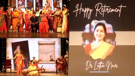 Dr Latha retired after a long career spanning 33 years. The makeup work started at six in the morning. It took about two-and-a-half hours to complete the makeup of each character. Finally, when the farewell program began in the college auditorium, Lata was astonished to see her colleagues re-creating some of her favourite paintings.