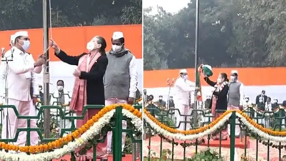 Congress party top brass was left red-faced on Tuesday morning when the party's flag hoisting on the occasion of its 137th Foundation Day did not quite go as planned. Congress Interim President Sonia Gandhi saw the Congress flag come fluttering down upon her as she pulled at the strings to unfurl it. The Congress officer bearer, standing next to Sonia, is heard saying, "pehli baar hua aise" (this is the first time this has happened).