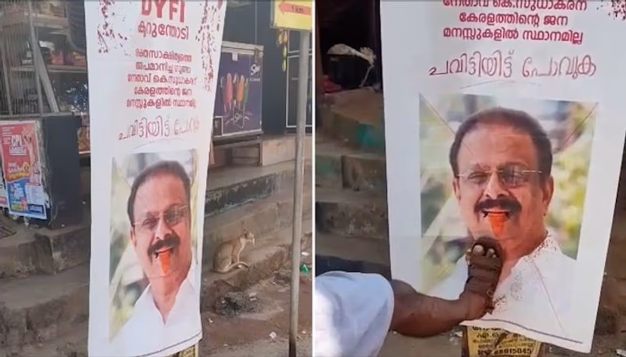 Sudhakaran flayed the Communist party for shedding crocodile tears over the killing of Dheeraj. Infuriated by these remarks, DYFI cadres put up a poster of Sudharakan on a pole. The writing on it urged comrades to step on a pile of mud left below the poster and to stomp on Sudhakaran’s face to register their protest.