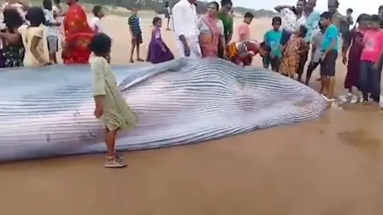 Discover the rare sighting of a majestic blue whale washed ashore at a beach in Andhra Pradesh's Srikakulam. Witnessed by local villagers and fishermen, the 25-foot-long, five-ton creature captivates with its immense size. Amidst heavy rainfall in the region, the incident has sparked curiosity, as blue whales are seldom stranded on Andhra Pradesh's shores.
