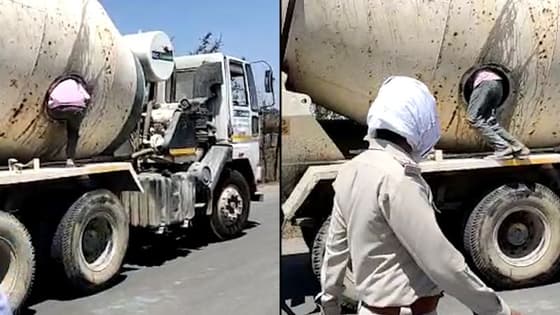 The video shows the concrete mixer parked along the side of a road while, one by one, migrant labourers with their few belongings in tattered cloth bags emerge from the steel drum.