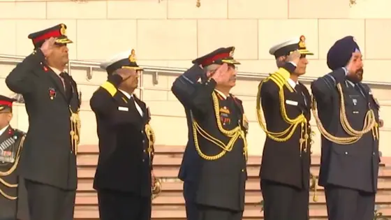 Navy Chief Admiral Karambir Singh along with VCOAS Lt Gen MM Naravane, and Vice Chief of Air Force, Air Marshal HS Arora paid tributes at the National War Memorial on Wednesday on the occasion of Navy Day.