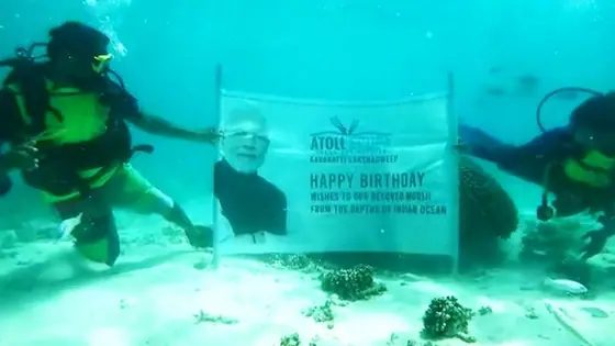 Meanwhile, scuba divers from Lakshadweep celebrated PM Modi's birthday in the 14-metre deep sea. Since it is the monsoon season at this time, the danger in the sea is high, yet the scuba team did not give up.