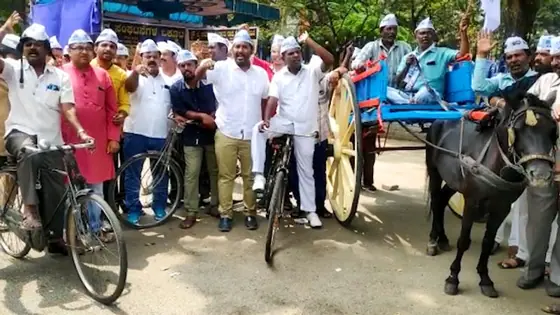 AAP workers on cycles and tonga carts shouted slogans condemning Karnataka CM Yediyurappa and the Centre over hike in petrol and diesel prices