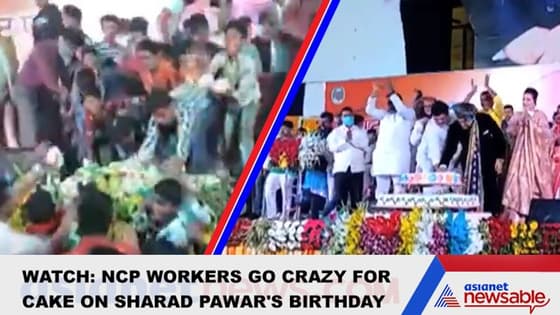 NCP workers push, pounce on each other, and scoop out large pieces of an 81 kg cake at an event that was organised by NCP leader Dhananjay Munde on the occasion of party chief Sharad Pawar's 80th birthday.