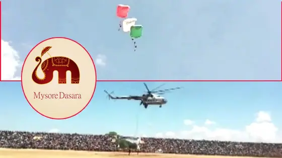 Mysuru (Karnataka): An air show was organised as a part of Dasara air show at Bannimantap Ground in Mysuru on October 2. The 40-minute show featured petal dropping, slithering operation and sky diving. Mysuru Dasara was inaugurated on September 29 and will go on till October 8.
