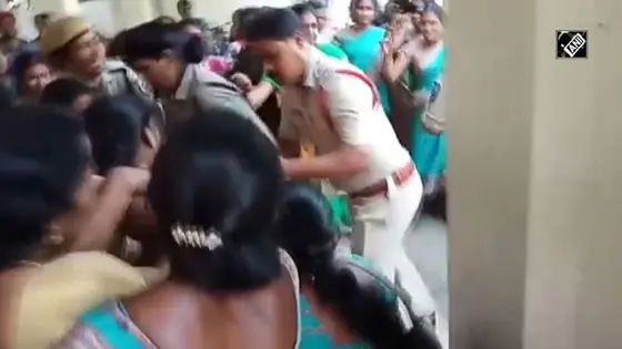 Visakhapatnam: A policeman manhandled women protesters at MVP Police Station in Visakhapatnam, Andhra Pradesh. MEPMA (Mission Elimination of poverty in Muncipal Areas) employees staged a protest in front of the residence of state’s tourism minister MS Rao to clear their pending wages. Women police were present at the spot but still thr policemen manhandled women protestors, which left them angry.