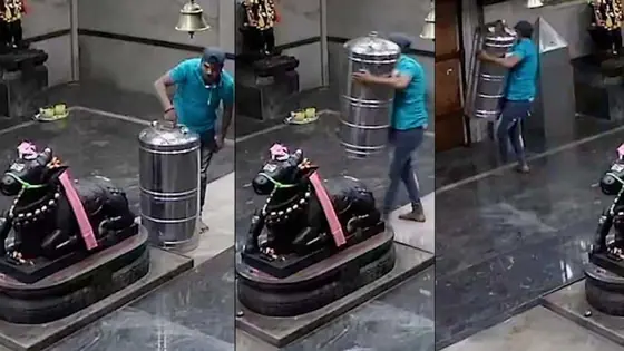 The footage shows two men entering the temple and running away with the donation box from the temple on the outskirts of Bengaluru