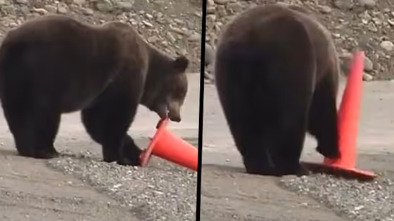 Bear picks up fallen traffic cone and keeps it on the road, watch this viral video