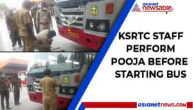 Seeking divine blessings, a KSRTC bus driver and conductor performed pooja before starting their assigned bus. The vehicle was in the Mandya depot for the last two months following the lockdown due to coronavirus.