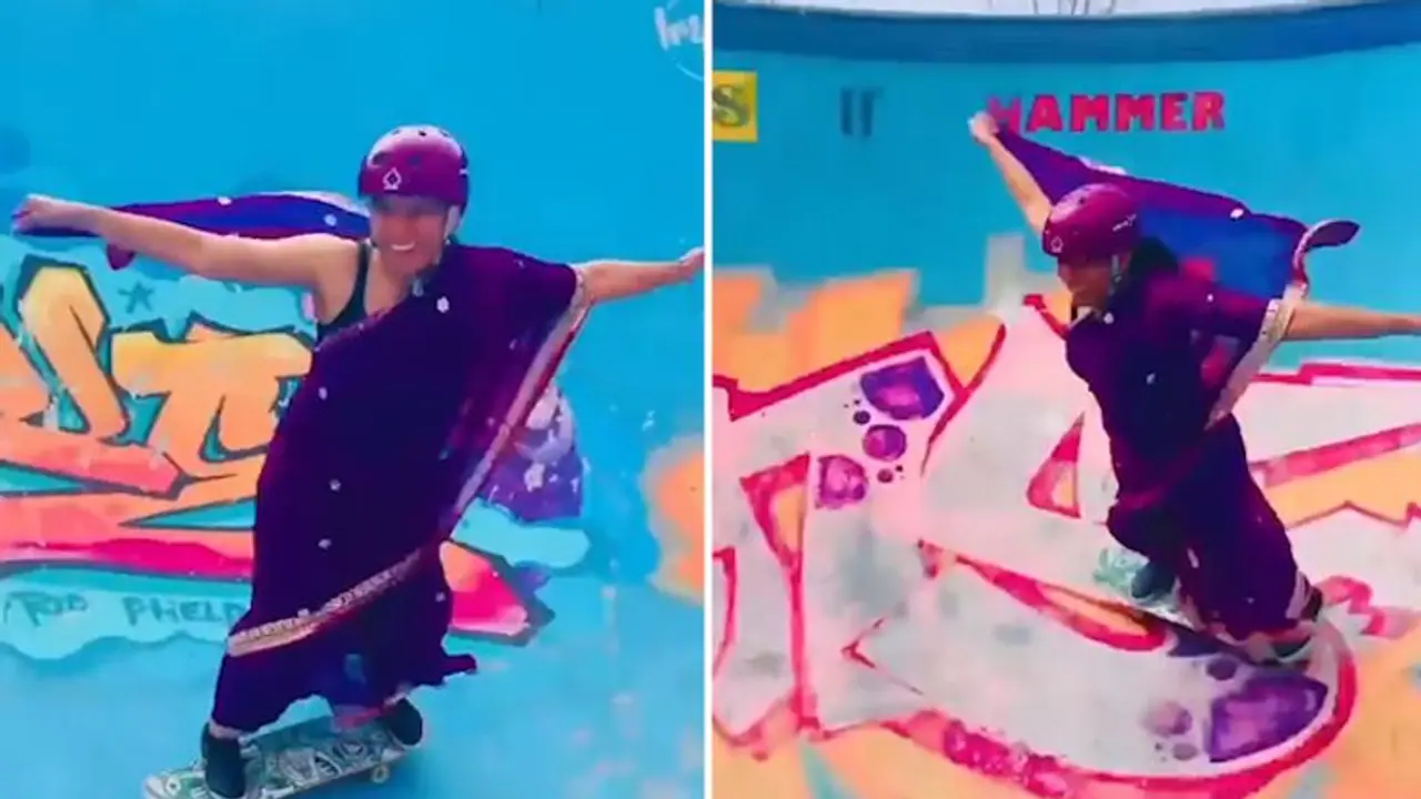 In the video, she can be seen wearing a bright-hued saree and performing cool skating moves with ease.