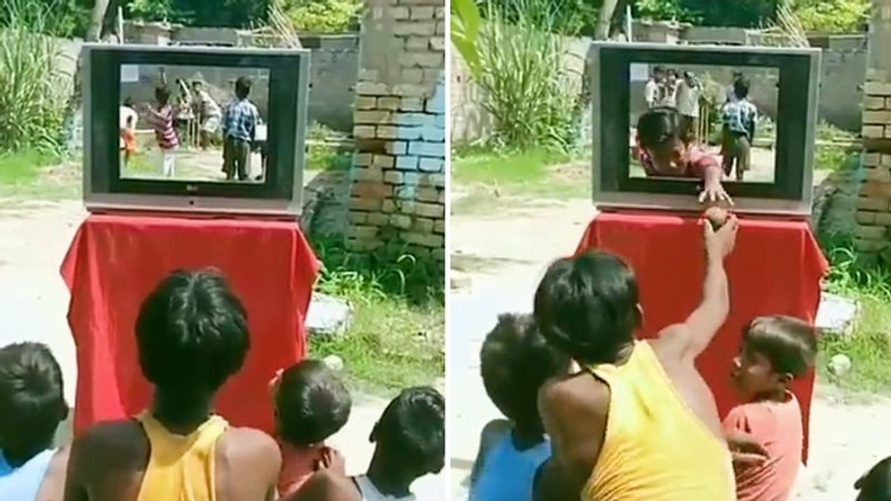 In the video, a few kids can be seen watching television and a cricket match can be seen on the screen.
