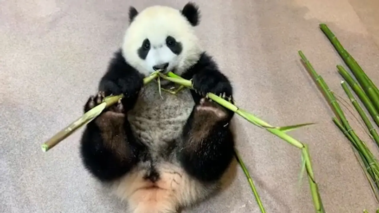 In the video, celebrity panda Xiao Qi Ji, from Smithsonian’s National Zoo, can be seen munching on bamboos.