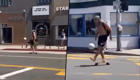A video of a freestyle footballer riding a skateboard and juggling a football simultaneously has gone viral.