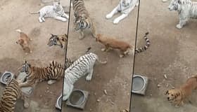 A viral video shows a golden retriever dog wagging his tail and barking as he walks between a number of tigers, including white tigers.