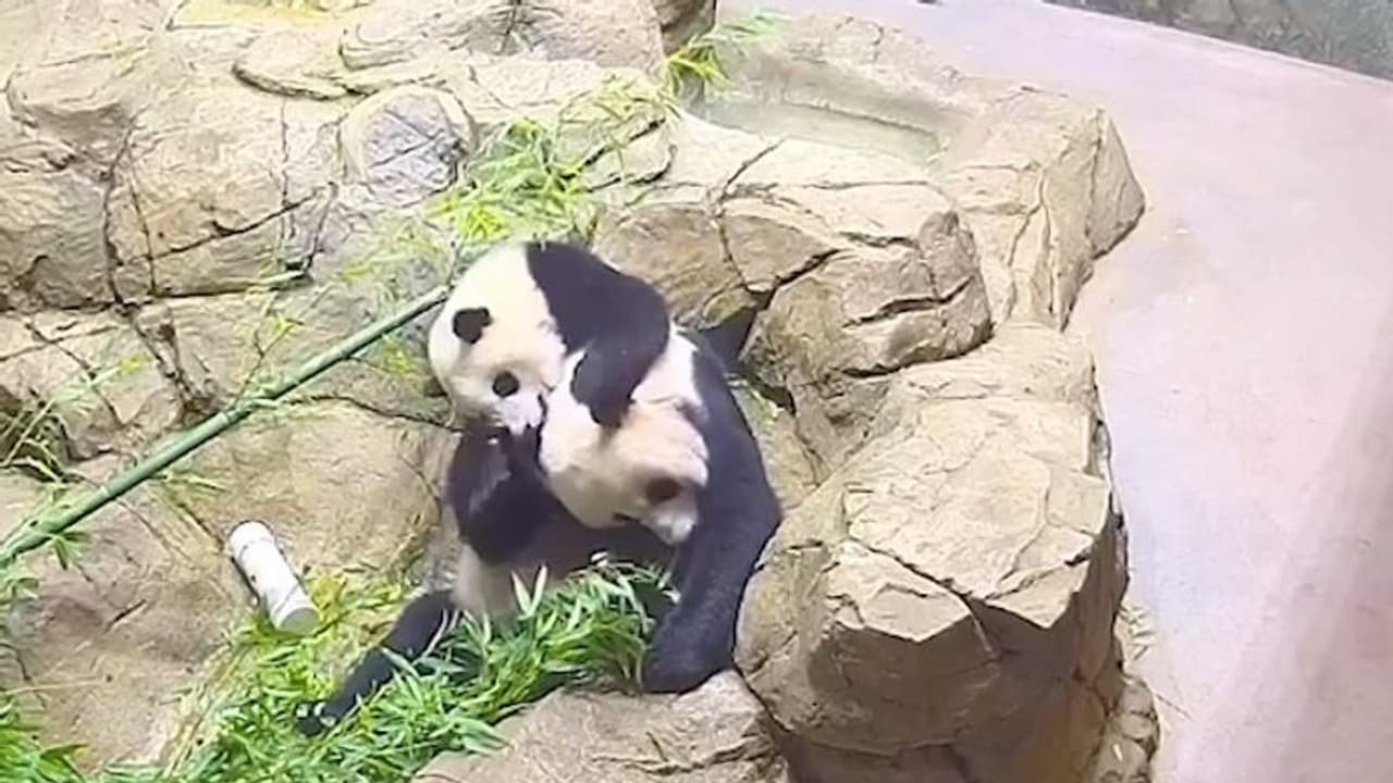 A video of a giant panda cub named Xiao Qi Ji plays with its mama, Mei Xiang, goes viral.