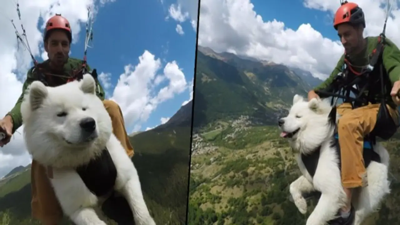 An adorable video shows adventure film director Shams and his dog Ouka paragliding over the picturesque mountain in France.