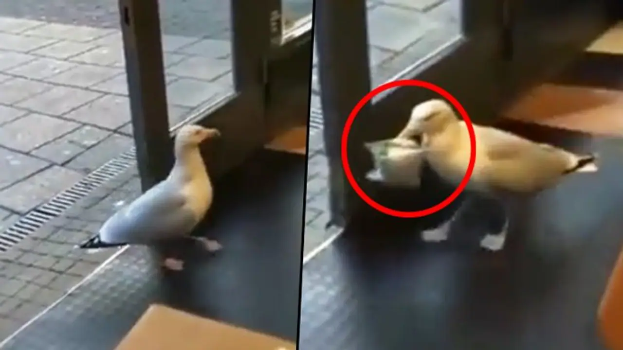 A seagull bird walking into a store and stealing a bag of chips has emerged on social media.
