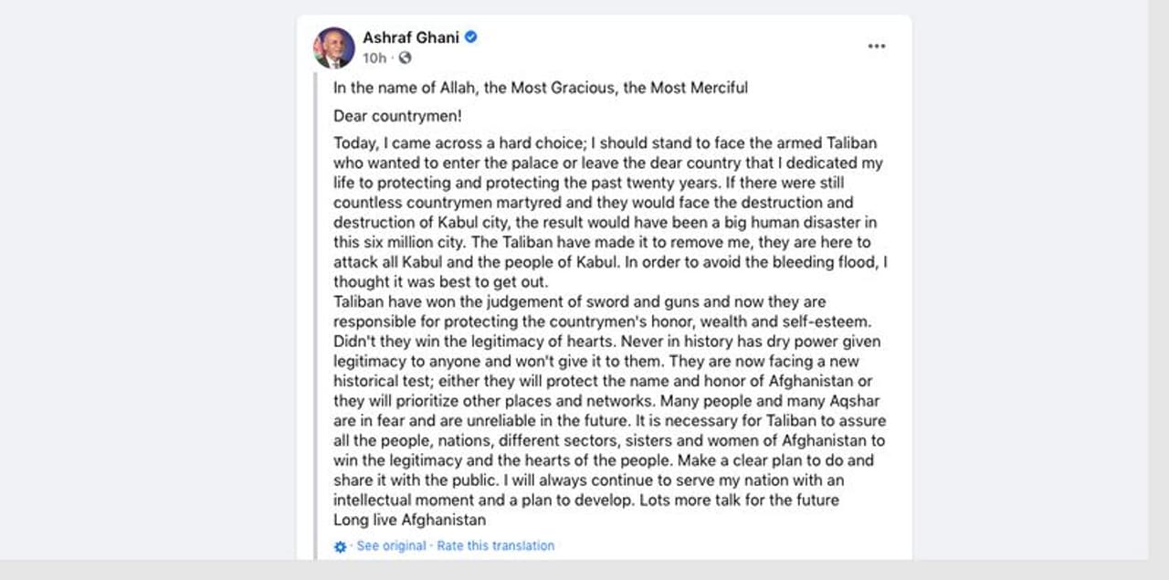 In his first comments since leaving Afghanistan, Ghani said in a Facebook post on Sunday that he faced with a "difficult choice" between the "armed Taliban" who wanted to enter the Presidential Palace and "leaving the dear country that he has dedicated life to protecting for the past 20 years."
