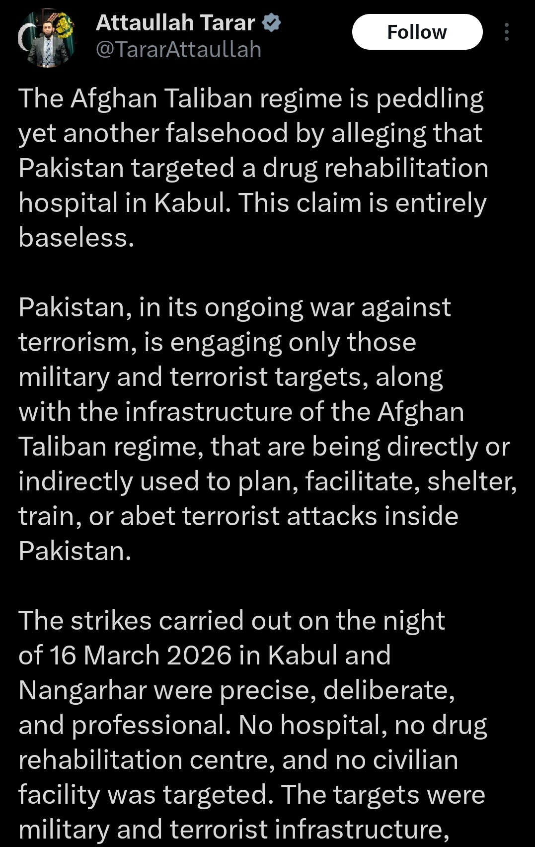 “No hospital, no drug rehabilitation centre, and no civilian facility was targeted. The targets were military and terrorist infrastructure, including ammunition and technical equipment storage sites and other installations linked to hostile activity against Pakistan.”