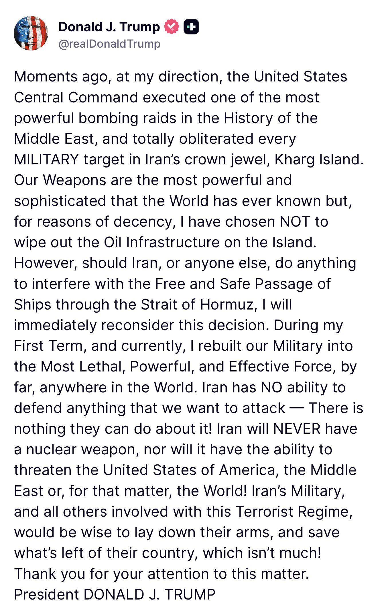 "Moments ago, at my direction, the United States Central Command executed one of the most powerful bombing raids in the History of the Middle East, and totally obliterated every MILITARY target in Iran's crown jewel, Kharg Island," Trump said.