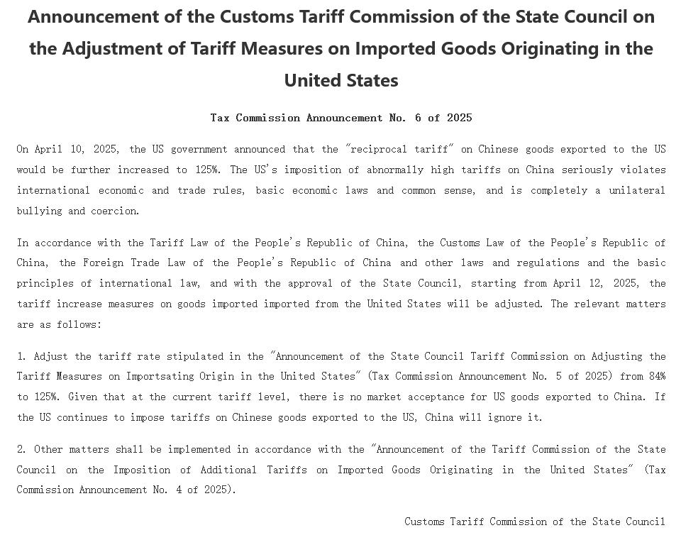 China announced on Friday that it will increase tariffs on US products to 125 per cent, intensifying the ongoing trade conflict between the two largest global economies.