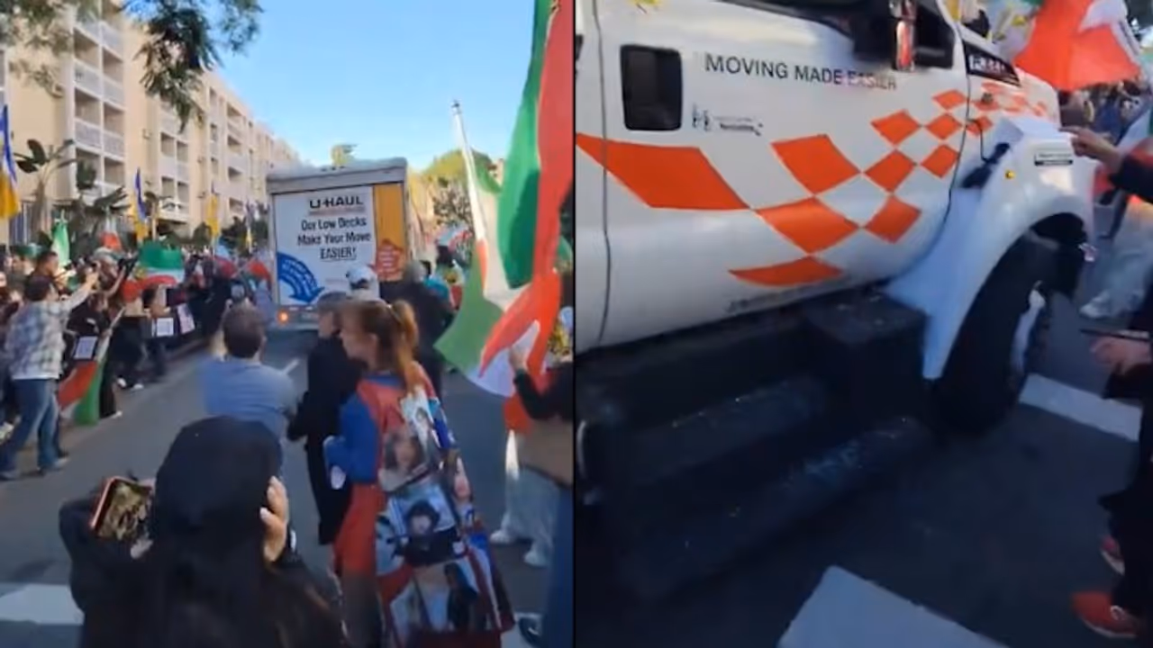 A U-Haul box truck drove into a crowd of demonstrators on Sunday afternoon during an anti-Iranian regime rally in the Westwood neighbourhood of Los Angeles, leaving the protest in chaos and forcing law enforcement to intervene.