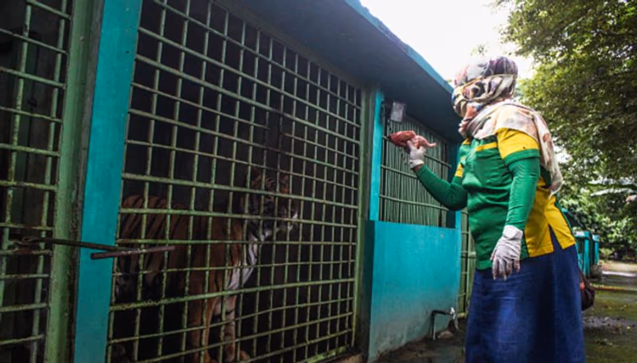 A worker feeds a Sumatran Tiger at the Medan city zoo, Indonesia