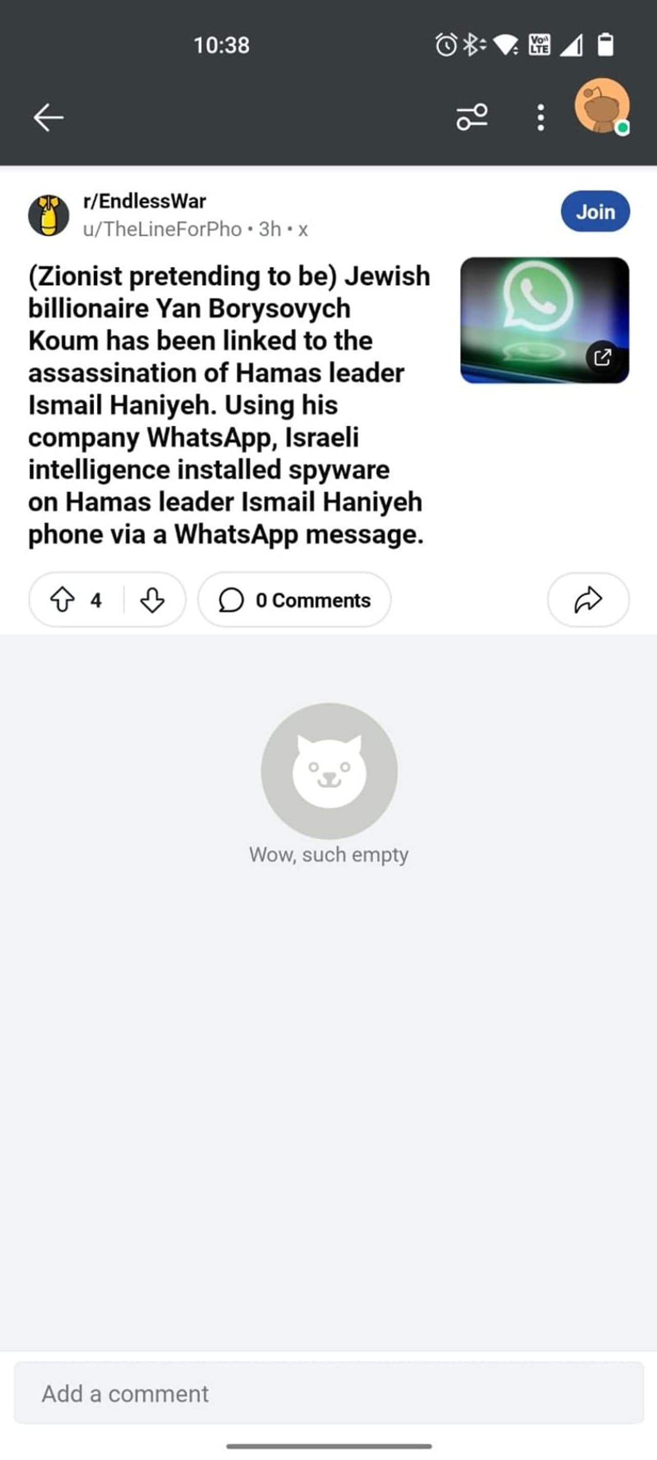 "Jewish billionaire Yan Borysovych Koum has been linked to the assassination of Hamas leader Ismail Haniyeh. Using his company WhatsApp, Israeli intelligence installed spyware on Hamas leader Ismail Haniyeh phone via a WhatsApp message. The exact location of Ismail Haniyeh was then given and IDF used a drone to launch a missile strike," alleged the user on X. A similar claim was posted on Reddit as well.