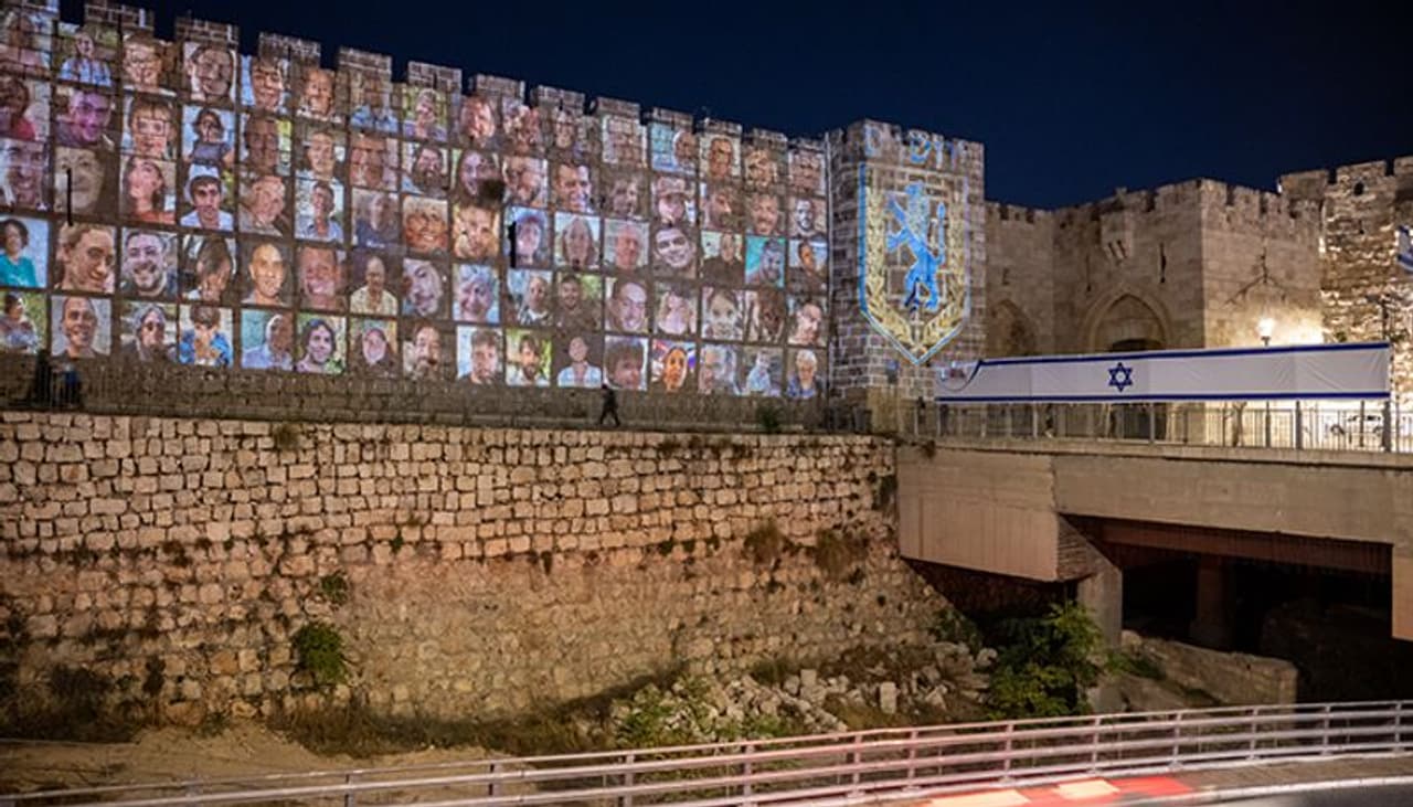 Marking one month since the horrifying Hamas attack, a special projection of the faces of the 240 Israeli hostages in Hamas' captivity were projected outside of Jaffa gate during a special ceremony at the Western Wall in the Old City in Jerusalem on Monday night.