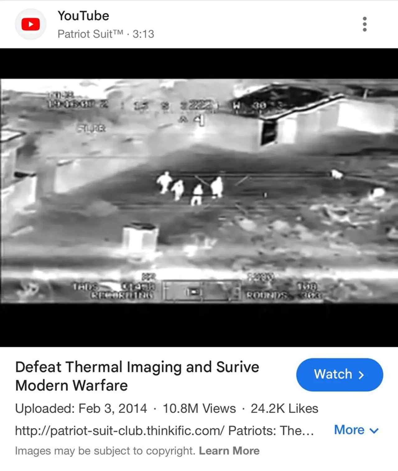Further investigation reveals that the same video was reposted on YouTube in February 2014 under a different title, "Defeat Thermal Imaging and Survive Modern Warfare." The reupload under a new title indicates that the video has been repurposed and circulated multiple times over the years, potentially to falsely represent various military engagements.