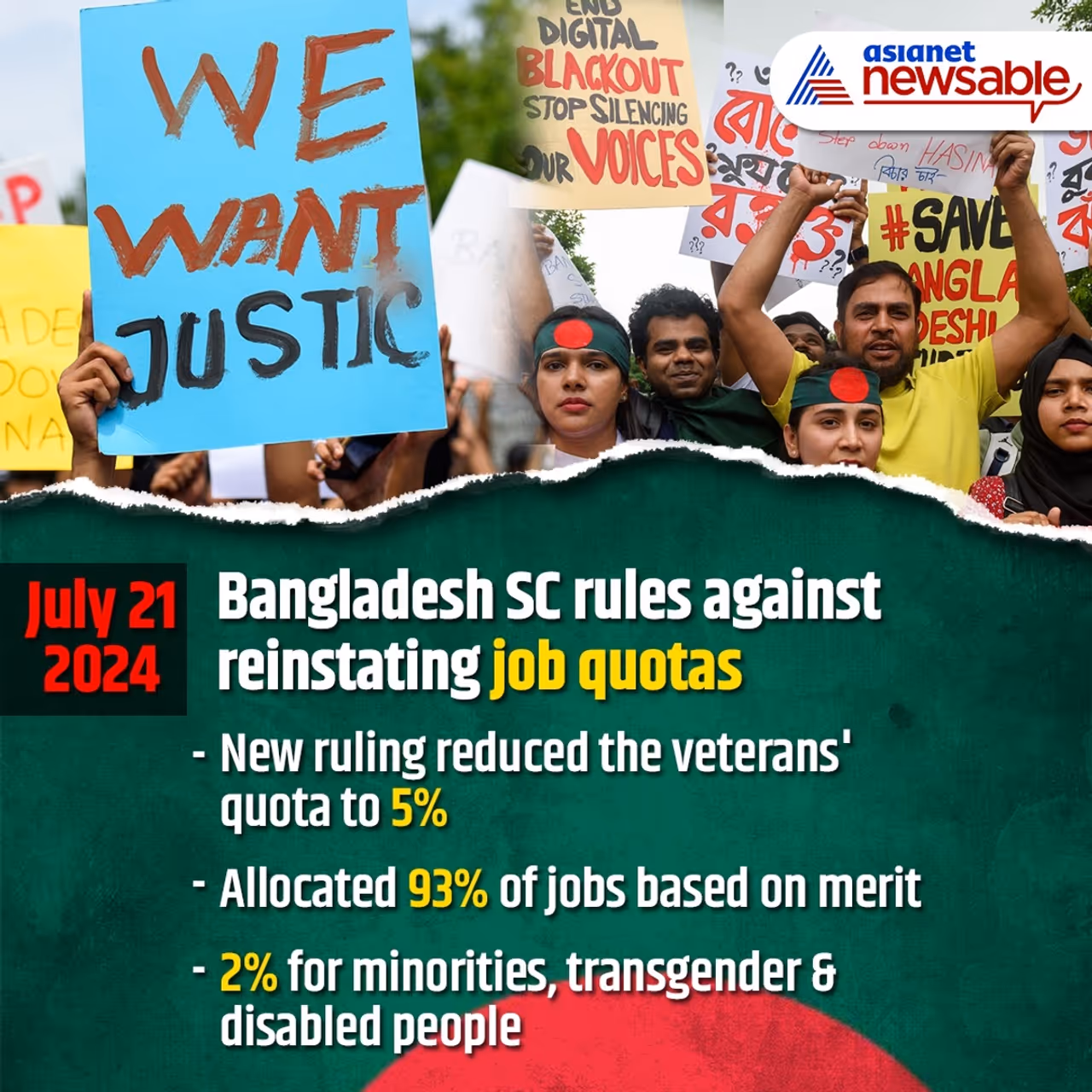 On July 21, the Supreme Court overturned the lower court's decision to reinstate the quota. The ruling reduced the veterans' quota to 5 percent (down from 30 percent) and allocated 93 percent of jobs based on merit. The remaining 2 percent will be reserved for ethnic minorities, transgender individuals, and people with disabilities.