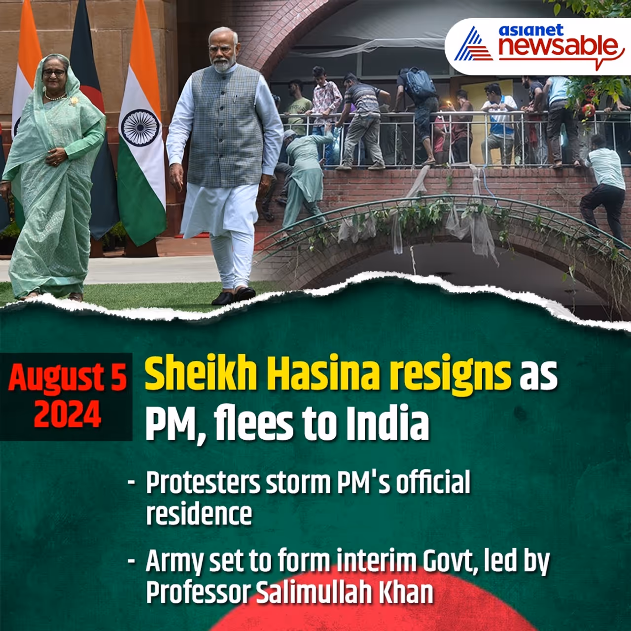 On August 5, protesters stormed PM Sheikh Hasina's palace moments after she announced her resignation and fled to India. Bangladesh Army chief Waker-uz-Zaman made a rare TV appearance and announced that the Army will form an interim government. Noted Bangladeshi writer Professor Salimullah Khan was named as the head of the interim government, according to Bangladesh Nationalist Party (BNP).