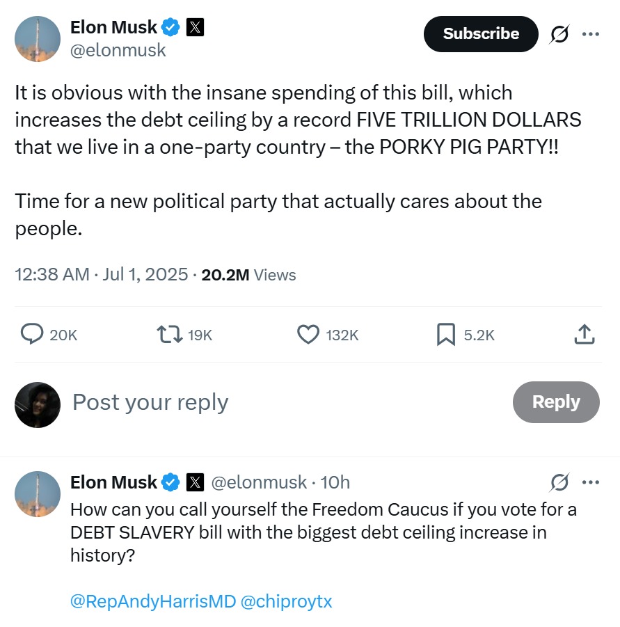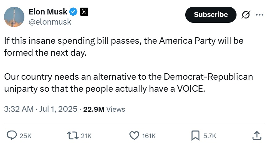 In one of his many posts, Musk said that if the bill passes, he would start a new party. “If this insane spending bill passes, the America Party will be formed the next day,” he warned.