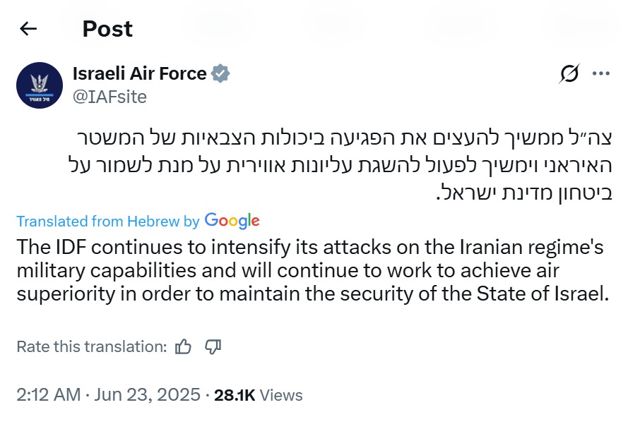"The IDF continues to intensify its attacks on the Iranian regime's military capabilities and will continue to work to achieve air superiority in order to maintain the security of the State of Israel," it added.