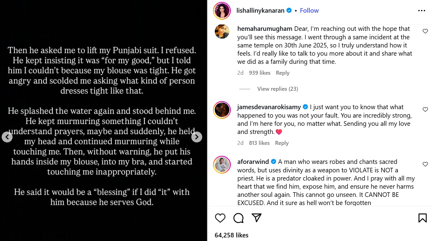 Lishalliny's decision to come forward has drawn support from many across Malaysia and abroad. Her story has sparked conversations around sexual assault in places of worship, power imbalance, and the importance of speaking out.