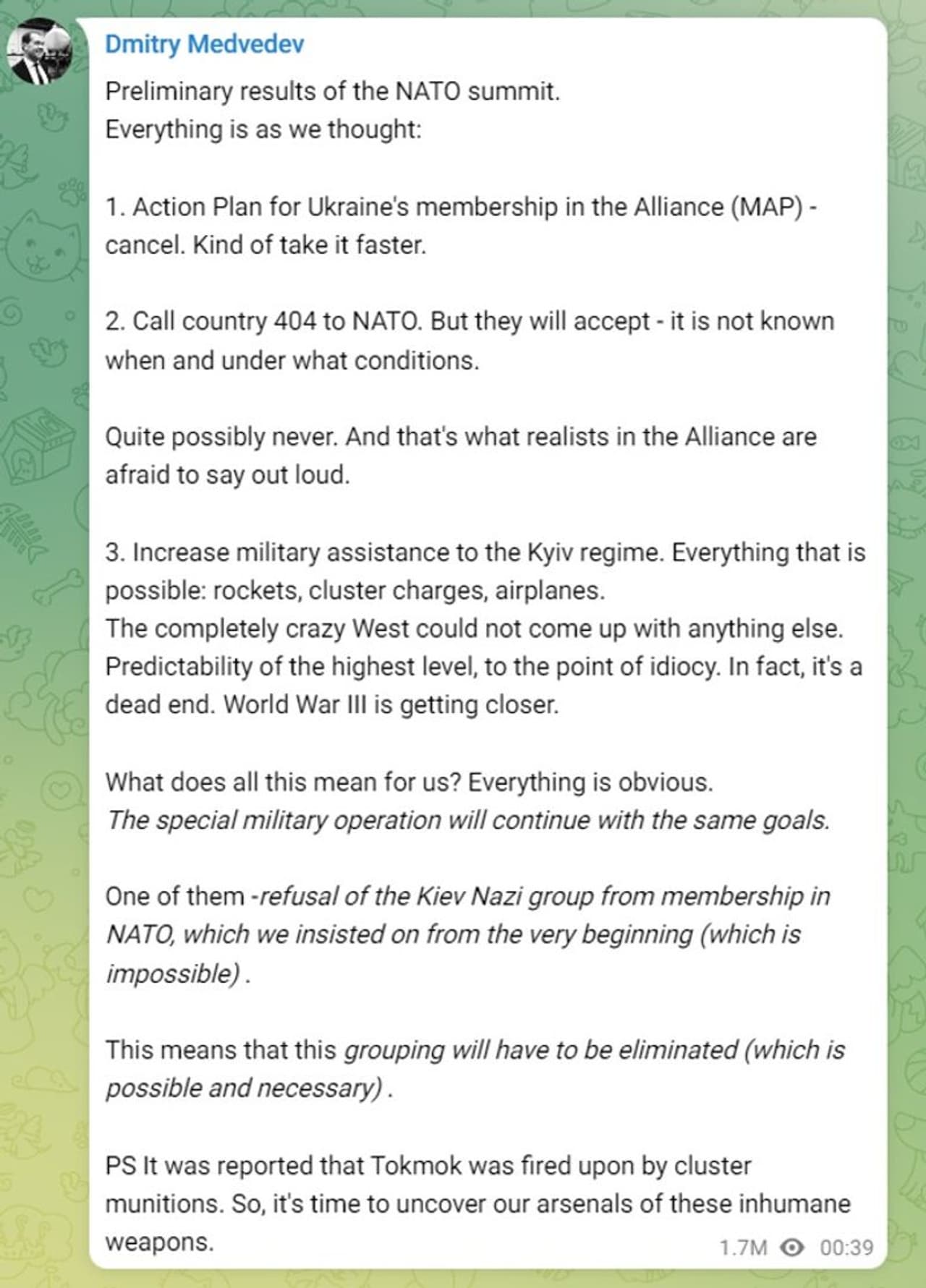 Former Russian President Dmitry Medvedev warns of a looming third world war as the "completely mad West" supports Ukraine, while tensions rise at the NATO summit and Ukrainian President Zelenskyy demands a clear timeline for NATO membership.