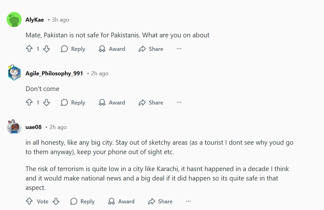 Although some comments used humour or sarcasm, the overall tone of the discussion showed unease. Even those defending Karachi admitted that caution is essential and that crime is part of daily life.