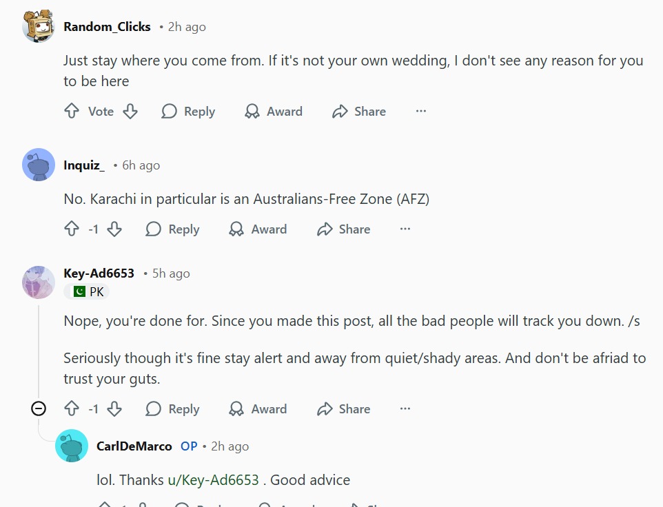 The post was shared by an Australian user planning to visit Karachi for a wedding. While the traveller said he was excited to experience Pakistani hospitality, he also raised concerns about safety after seeing Australia'stravel advisory, which asks citizens to “reconsider the need to travel” to Pakistan.