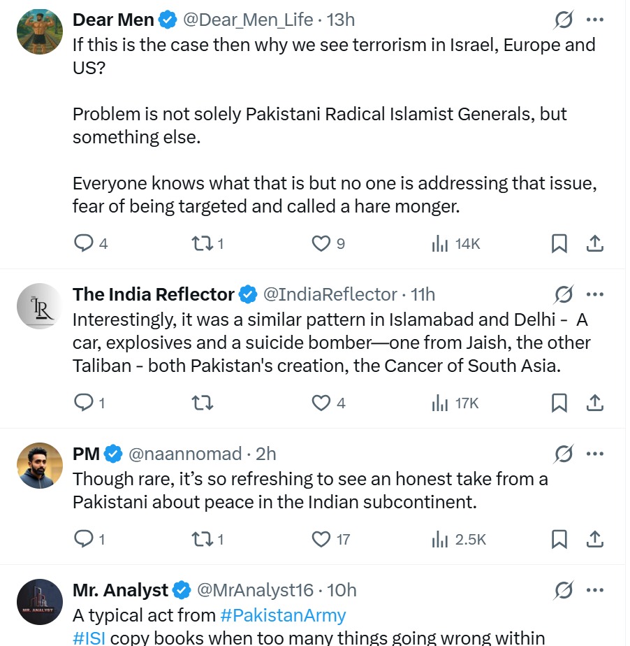 On X, journalist Taha Siddiqui wrote that in the last 24 hours both Delhi and Islamabad were struck by suicide bombers 'that #PakistanArmy calls its assets'. He added that there can be no peace in South Asia while Pakistan's generals use '#Islamist Terrorism as a domestic & foreign policy tool'. This short post quickly drew wide attention and hundreds of replies.