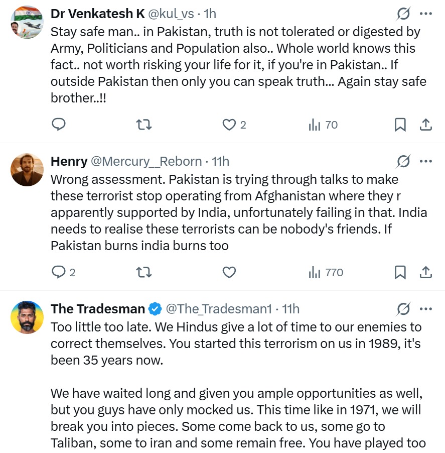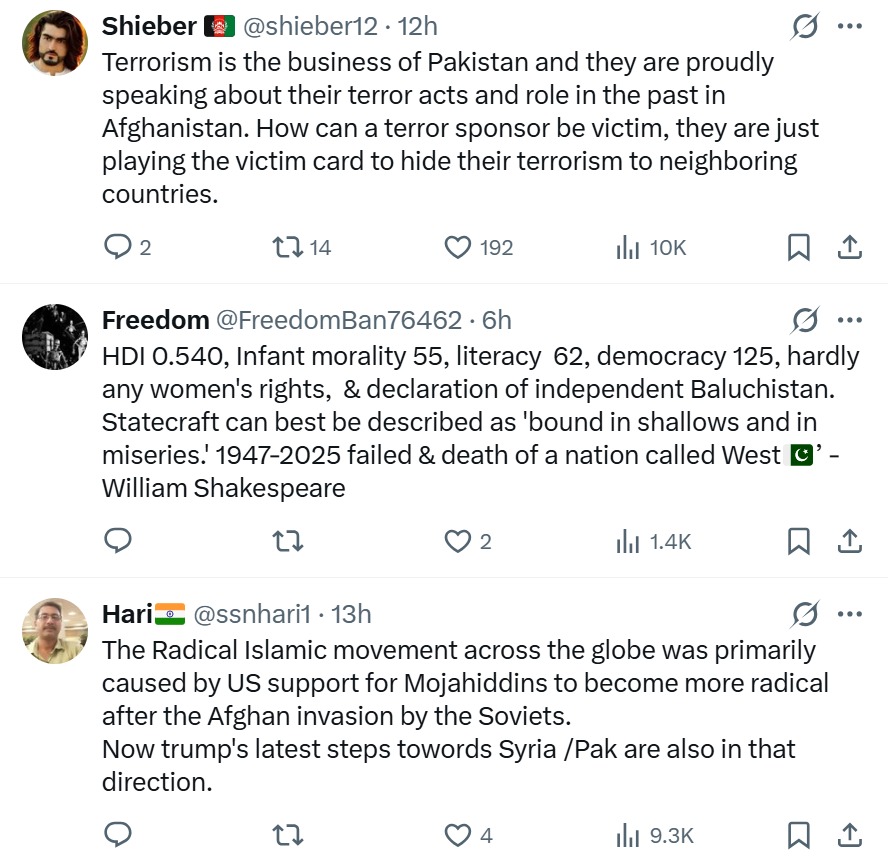 Siddiqui's X post generated many different replies. Some people on social media agreed with him, saying security services and foreign powers have long used militancy as a tool in the region. Others blamed external players such as the United States, India, or historical events like the Soviet war in Afghanistan for enabling radical groups. Several comments said Pakistan must reform or face consequences; others urged caution, arguing Pakistan was trying to control militants through talks or that India might be involved in destabilising activity.