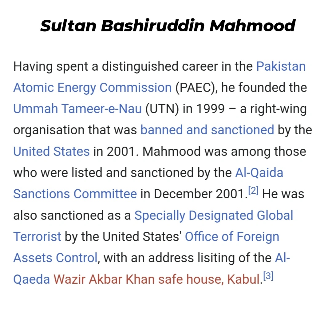 His father, Sultan Bashiruddin Mahmood, who met Osama bin Laden and tried to hand over nuclear weapons technology to terrorists. He features on the UN Security Council's al-Qaida Sanctions Committee list of terrorists.