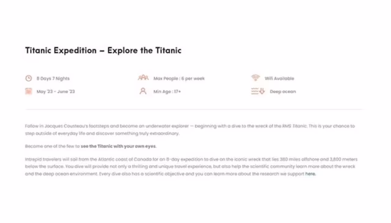 "Your dive will provide not only a thrilling and unique travel experience, but also help the scientific community learn more about the wreck and the deep ocean environment," it adds. It lists two 'missions' in June 2024 and says the June 2023 mission is 'currently underway'.