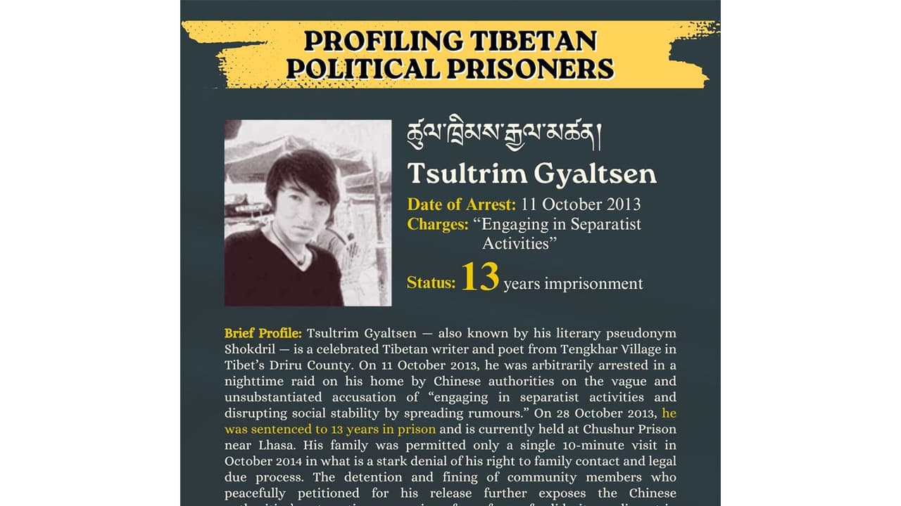 He was subsequently sentenced to 13 years in prison later that month. According to the CTA, Gyaltsen, also known by his literary pseudonym "Shokdril" is a respected poet and essayist from Driru County. His works, including Chimes of Melancholic Snow and The Fate of Snow Mountain, have earned recognition for their reflective and critical tone on Tibetan identity and society.